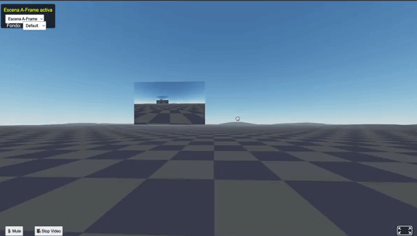 Una vez se acceda a la escena, nos encontraremos con distintos botones de carácter HTML, en los que podremos apagar/encender el micrófono y la cámara, elegir qué cámara se va a transmitir y con la que el otro usuario nos verá y elegir el fondo de la escena 3D.